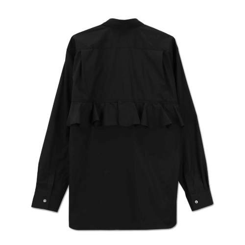 CDG Black Frill Insert Shirt Made from high-quality 100% cotton, the shirt offers both comfort and durability while maintaining a polished, high-fashion silhouette. The most eye-catching element is the elegant frill insert featured at the hem and across the yoke. These ruffle accents bring a soft, feminine contrast to the otherwise minimalist black shirt, creating a unique interplay of sharp and soft elements.